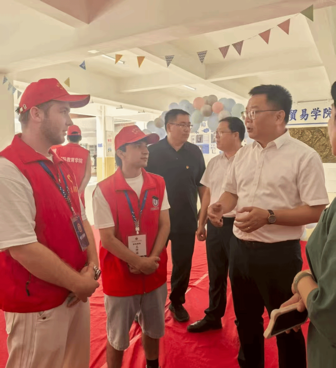 ▲学校领导专程前往我院迎新接待点,与迎新志愿者们亲切交谈,细致询问工作情况及学习生活现状并致以关怀与鼓励