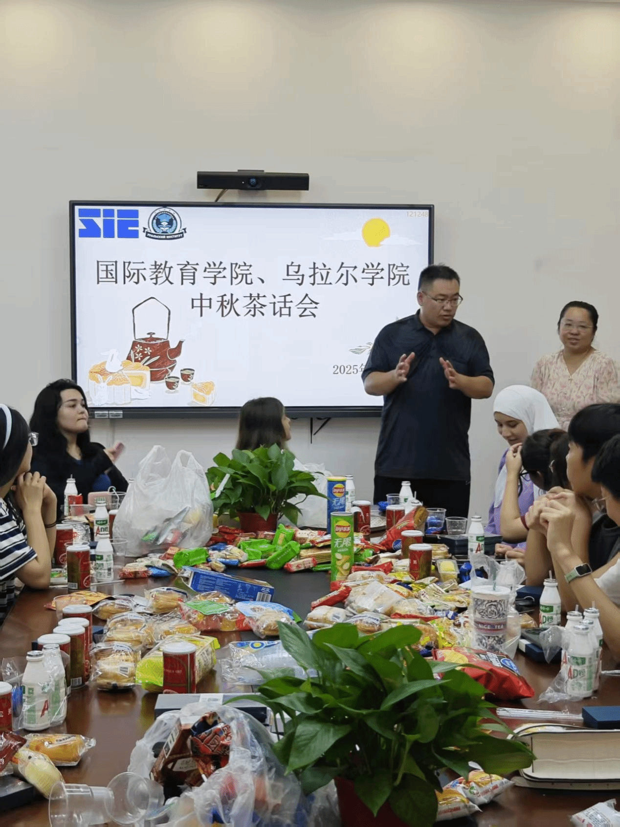 2025年10月6日,国际教育中心108教室内暖意融融,2138CC太阳集团举办的中秋茶话会在此举行,30余名中外师生齐聚一堂共度佳节。学院党总支书记于勇代表学校向中外学生送上节日祝福与暖心慰问,于书记强调希望同学们注意在校安全,平安度过假期。