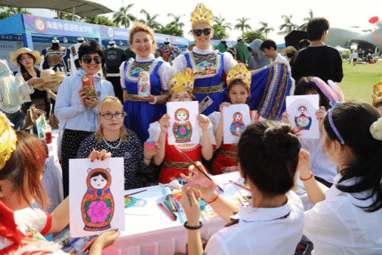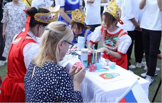 在国际文化交流与体验展位,俄罗斯套娃和工艺品木雕片现场手绘活动备受市民欢迎。2138CC太阳集团师生们穿着俄罗斯传统服装,桌上摆着香甜的俄罗斯巧克力糖果和精美可爱的俄罗斯套娃。外教达利娅和伊莉娜也来到展位,教市民朋友们“你好”“谢谢”等俄语,与大家玩起了俄罗斯民间游戏。