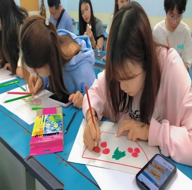活动现场,学生们耐心聆听俄语老师们讲解的俄罗斯套娃和俄罗斯小雕像文化,并一起欣赏各式各样的俄罗斯传统套娃和小雕像的纹样与制作过程。在视听的双重体验下,学生们也产生了浓厚的创作兴趣,在老师的指导与鼓励下,运用颜料、画笔与调色板进行构图、上色。经过多次修改,一套套独具特色的艺术品诞生了。学生们拿着自己创作的作品相互交流,陶醉于亲手制作所带来的别样成就感中。