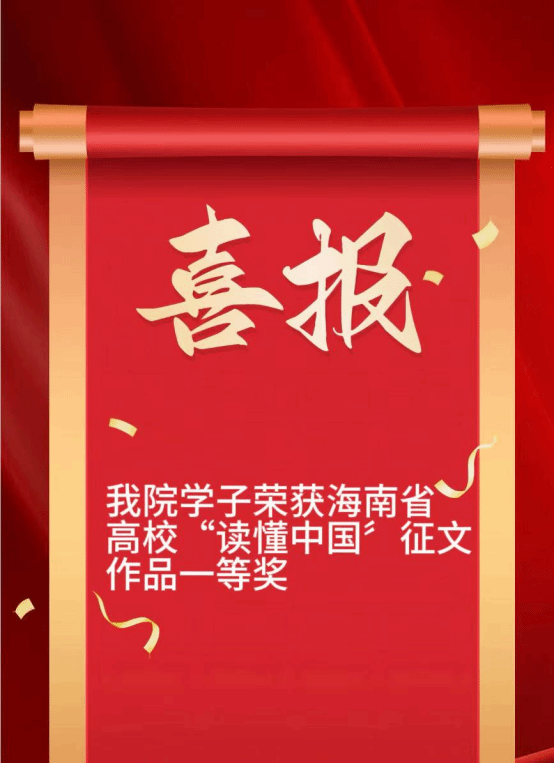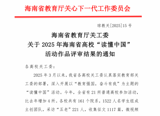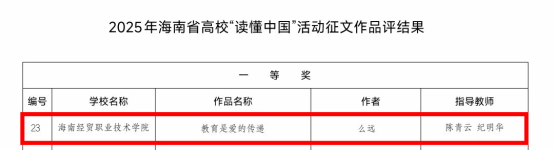 近日,由海南省教育厅关工委主办的2025年“读懂中国”征文比赛评审结果正式公布。在全省高校1117篇参赛作品中,我院2024级机电一体化技术班么远同学的作品《教育是爱的传递》脱颖而出,斩获一等奖。该作品紧扣主题、情感真挚,以细腻笔触勾勒“五老”的峥嵘岁月,用真情实感诠释其在从教育大国阔步迈向教育强国过程中的感人事迹、人生体验及所蕴含的改革创新及教育家精神,充分彰显新时代青年的深刻思考与责任担当。