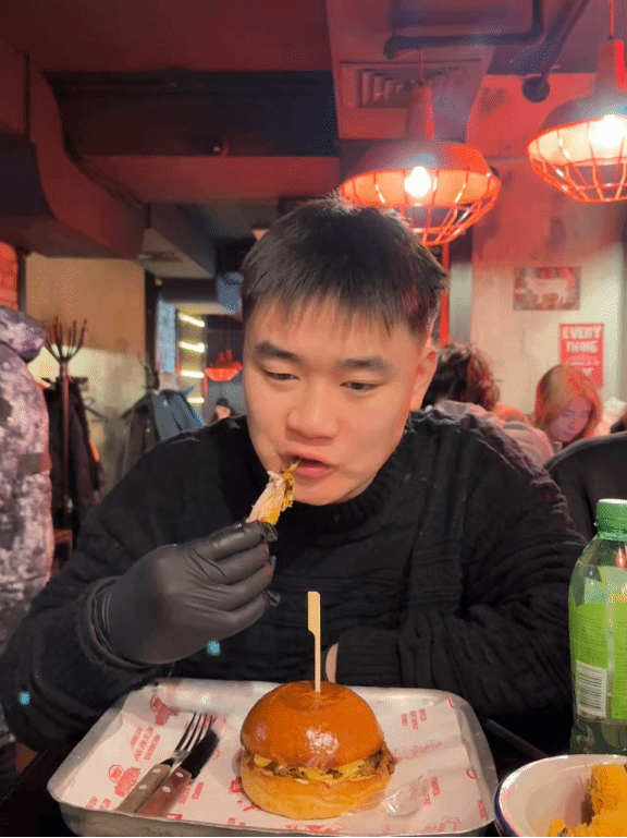 这张照片记录的是我第一次尝试吃本地汉堡。刚开始我对俄罗斯食物真的吃不惯,酸奶油、冷盘、红菜汤都很陌生。但慢慢地,我开始习惯,也会做一些中餐来解馋,偶尔还请同学们尝尝我的“家乡味”。那段时间,我在饮食这件事上学会了接受和适应,也从中找到了“生活其实没有那么难”的感觉。