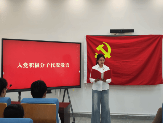 入党积极分子代表刘毅敏同学则代表全体积极分子发言,表达了向党组织靠拢的坚定决心,承诺将以党员为榜样,踏实进取、锤炼品格,争取早日加入党组织。